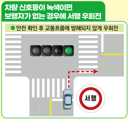 직진 차량신호등이 녹색이면 보행자가 없는 경우에 서행으로 우회전을 합니다.