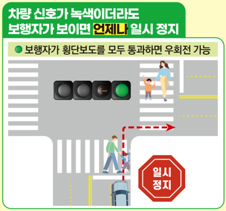 직진 차량 신호가 녹색이더라도 보행자가 보이면 언제나 일시정지해야 합니다.