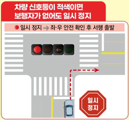 직진 차량 신호등이 적색이면 보행자가 없어도 언제나 일시 정지해야 합니다.