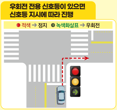 교차로에 우회전 전용 신호등이 있는 경우에는 신호등의 지시에 따라 진행하면 됩니다.