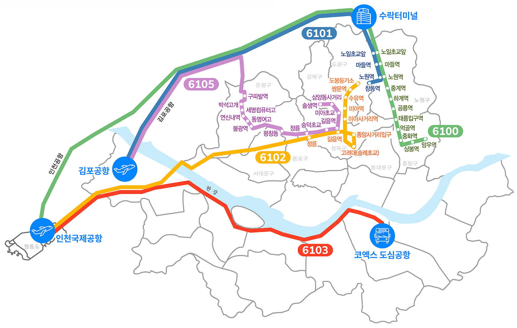 6100 : 중랑 수락 - 인천공항 6101 : 창동 노원 - 김포공항 6102 : 강북 성북 - 인천공항 6103 : 도심 공항 - 인천공항 6105 : 성북 은평 - 김포공항 |