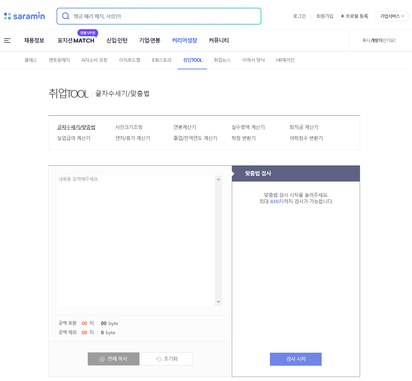 취업사이트 사람인(saramin)에 제공하고 있는 글자 수 세기, 맞춤법 검사기입니다. 최대 4천 자까지 검사가 가능합니다.