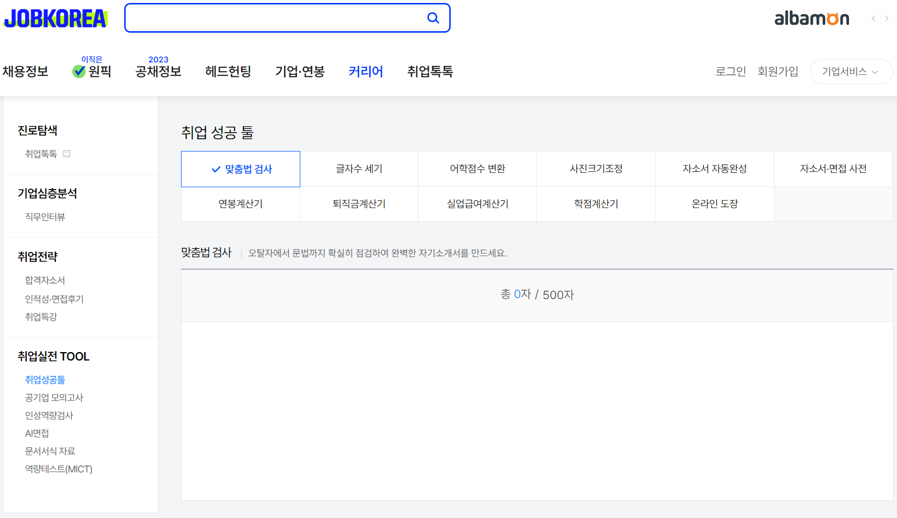 국내 대표 취업사이트 잡코리아(jobkorea)에서 제공하고 있는 맞춤법 검사기입니다. 자기소개서 작성에 제공되며, 글자 수 세기와 최대 500자까지 검사가 가능합니다. 글자 수 세기 등 다양한 기능을 제공하고 있습니다.