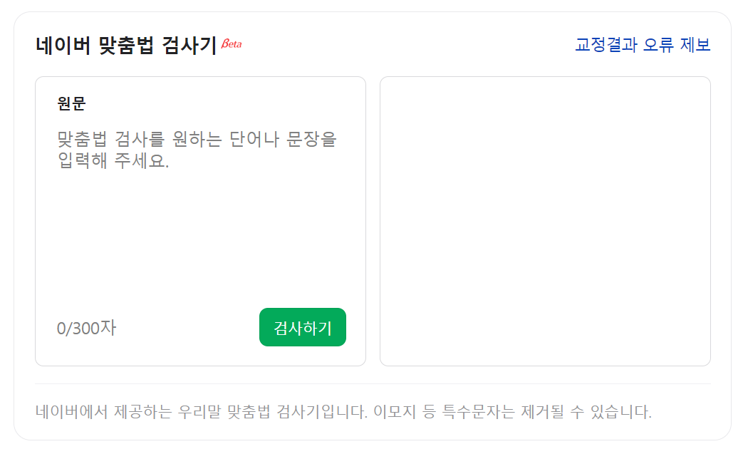 국내의 대표적인 포털사이트 네이버(Naver)에서 제공하는 맞춤법 검사기입니다. 최대 300자까지 검사가능합니다.