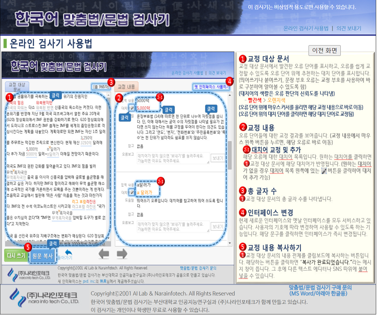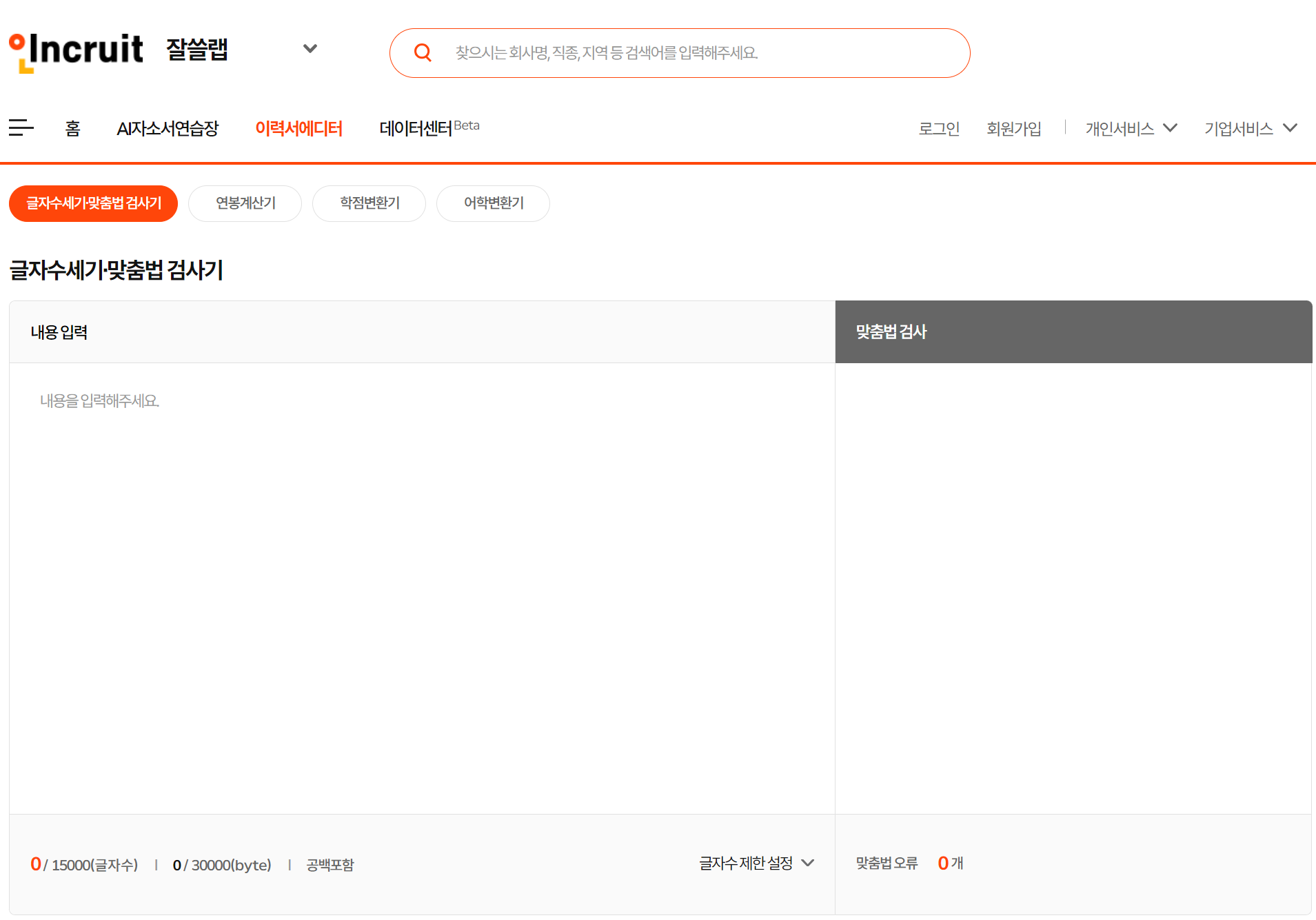 취업사이트 인크루트(incruit)에서 제공하고 있는 맞춤법 검사기입니다. 최대 15,000자까지 검사를 지원하고 있습니다.