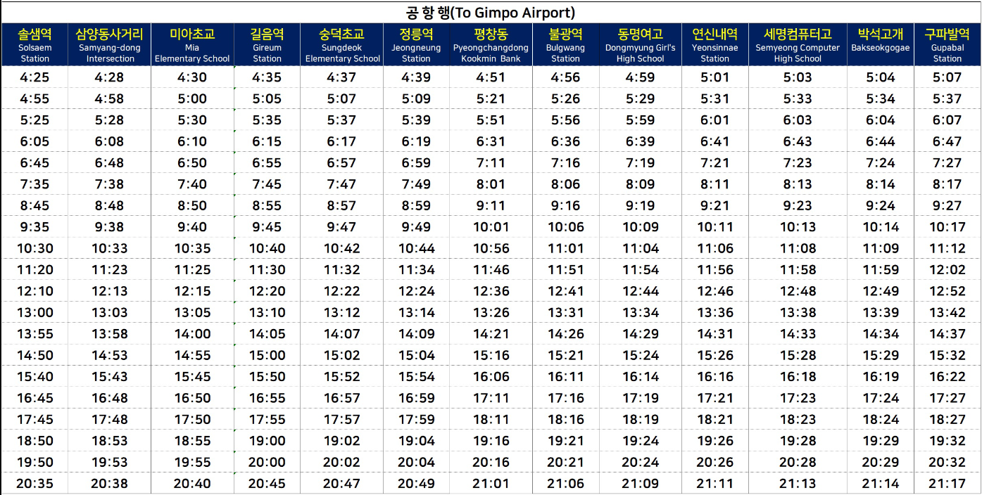 정류장의 운행시간은 도로상황, 교통상황 및 기상여건 등에 따라 부득이하게 변경될 수 있습니다. 아래 회사 홈페이지에서 각 정류장의 도착 예정시간과 실시간 버스 위치를 확인할 수 있습니다.