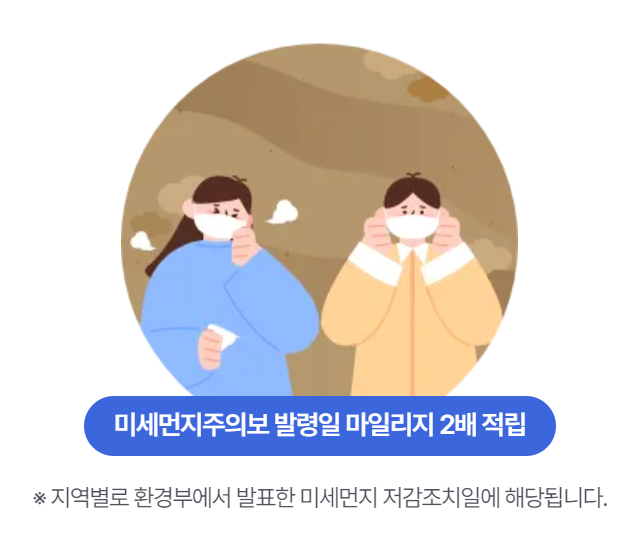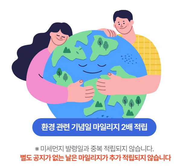 환경의 날, 미세먼지주의보 발령일에는 마일리지 2배 적립, 저소득층 서류 제출 시 최대 마일리지를 상향하여 적립할 수 있습니다.