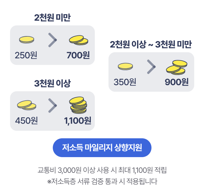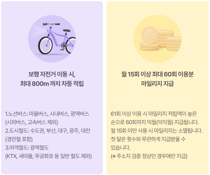 대중교통비 지출에 부담이 큰 서민의 교통비를 절감하고, 보행 · 자전거 등 친환경 교통수단을 동시에 활성화할 수 있는 새로운 수요관리 정책으로서 개인의 자발적인 노력을 통한 보상으로 대중교통 활성화를 유도하기 위해 지급되는 마일리지입니다.