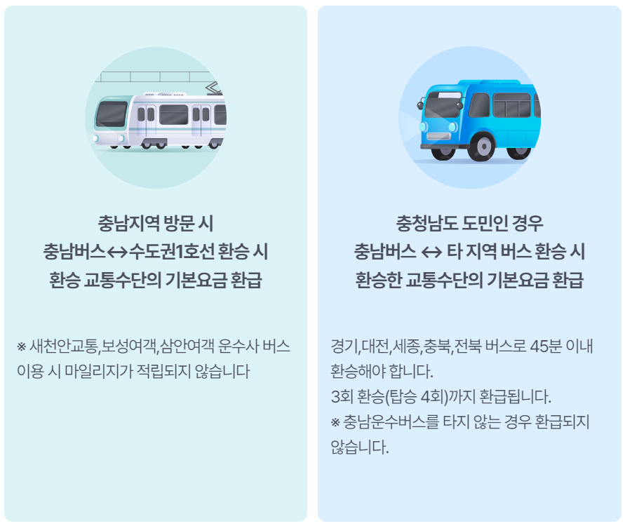 - 모바일페이 티머니 이용 시 충남 환승 마일리지 적립이 불가하오니 실물(플라스틱) 카드로 이용해 주시기 바랍니다.