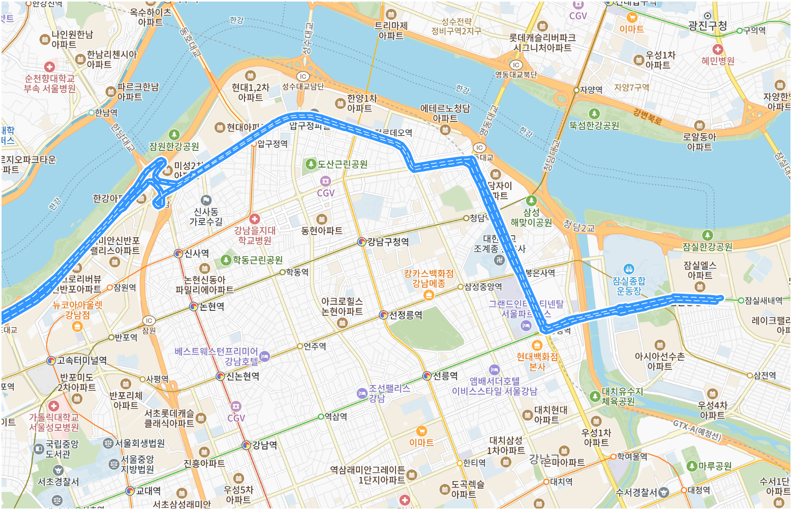잠실새내역 > 잠실종합운동장 > 코엑스 삼성역 > 리베라호텔, 알로프트 서울 강남 호텔 > 프리마호텔, 엔트라호텔 > 갤러리아백화점 > 압구정역, 현대아파트 > 신사중학교 > 인천공항 제1터미널 > 인천공항 제2터미널