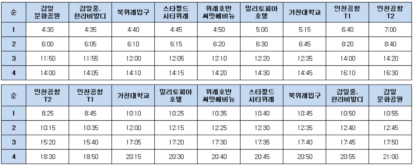 | 구분 | 감일문화공원 | 인천공항 T1 | 인천공항 T2 |