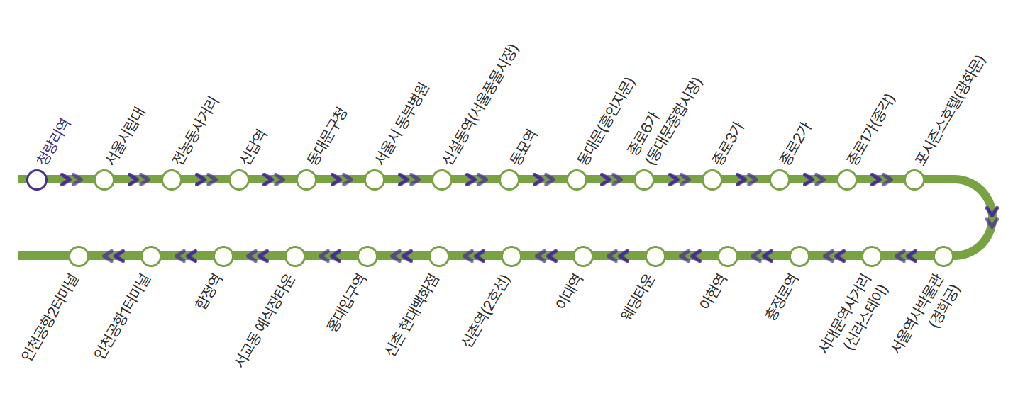 청량리역 > 서울시립대 > 전농동사거리 > 신답역 > 동매문구청 > 서울시동부병원 > 신설동역(서울풍물시장) > 동묘역 > 동대문(흥인지문) > 종로6가(동매문종합시장) > 종로3가 > 종로2가 > 종로1가(종각) > 포시즌스호텔(광화문) > 서울역사박물관(경희궁) > 서대문역사거리(신라스테이) > 충정로역 > 아현역 > 웨딩타운 > 이대역 > 신촌역(2호선) > 신촌 현대백화점 > 홍대입구역 > 서교동 예식장타운 > 합정역 > 인천공항1터미널 > 인천공항2터미널