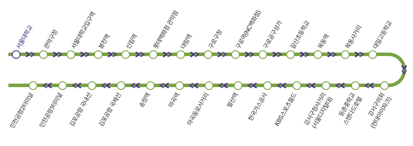 서울대학교 > 관악구청 > 서울대학교입구역 > 봉천역 > 신림역 > 롯데백화점 관악점 > 대림역 > 구로구청 > 구로역(NC백화점) > 구로공구상가 > 갈산초등학교 > 목동역 > 목동사거리 > 대일고등학교 > 강서구의회(현대아이파트) > 등촌중학교(스탠다드호텔) > 강서구청사거리(서울디지털대) > KBS스포츠월드 > 한국가스공사 > 발산역 > 마곡동로사거리 > 마곡역 > 송정역 > 김포공항 국제선 > 김포공항 국내선 > 인천공항1터미널 > 인천공항2터미널