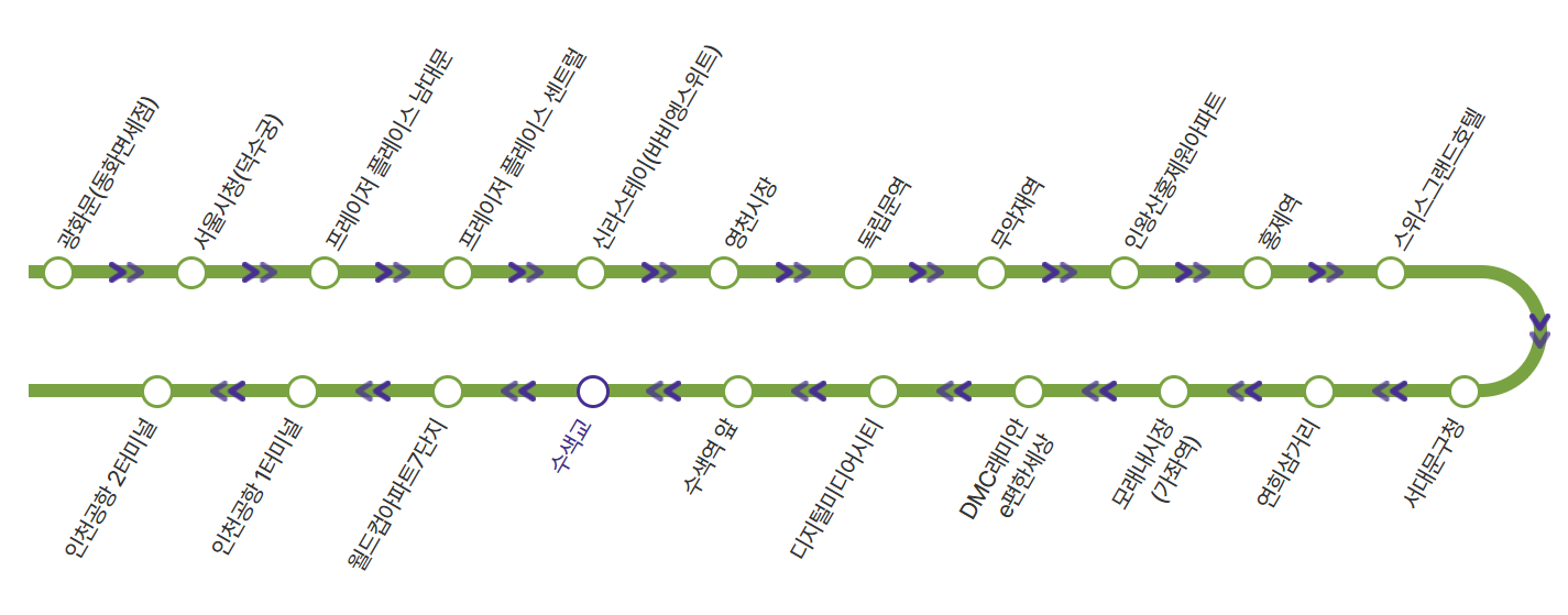 광화문(동화면세점) > 서울시청(덕수궁) > 프레이저 플레이스 남대문 > 프레이저 플레이스 센트럴 > 신라스테이(바비엥스위트) > 영천시장 > 독립문역 > 무악재역 > 인왕산홍제원아파트 > 홍제역 > 스위스그랜드호텔 > 서대문구청 > 연희삼거리 > 모래내시장(가좌역) > DMC래미안(e편한세상) > 디지털미디어시티 > 수색역 앞 > 수색교 > 월드컵아파트7단지 > 인천공항 1터미널 > 인천공항 2터미널