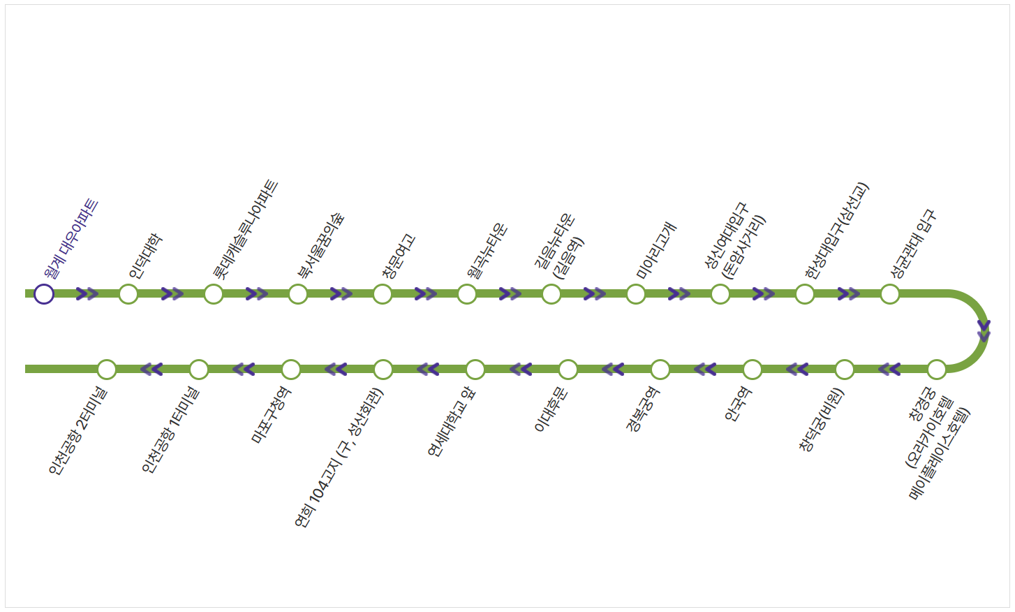 월계 대우아파트 >> 인덕대학 >> 롯데캐슬루나아파트 >> 북서울꿈의숲 >> 창문여고 >> 월곡뉴타운 >> 길음뉴타운(길음역) >> 미아리고개 >> 성신여대입구(돈암사거리) >> 한성대입구(삼선교) >> 성균관대 입구 >> 창경궁(오라카이호텔 메이플레이스호텔) >> 창덕궁(비원) >> 안국역 >> 경복궁역 >> 이대후문 >> 연세대학교 앞 >> 연희 104고지(구, 성산회관) >> 마포구청역 >> 인천공항 1터미널 >> 인천공항 2터미널