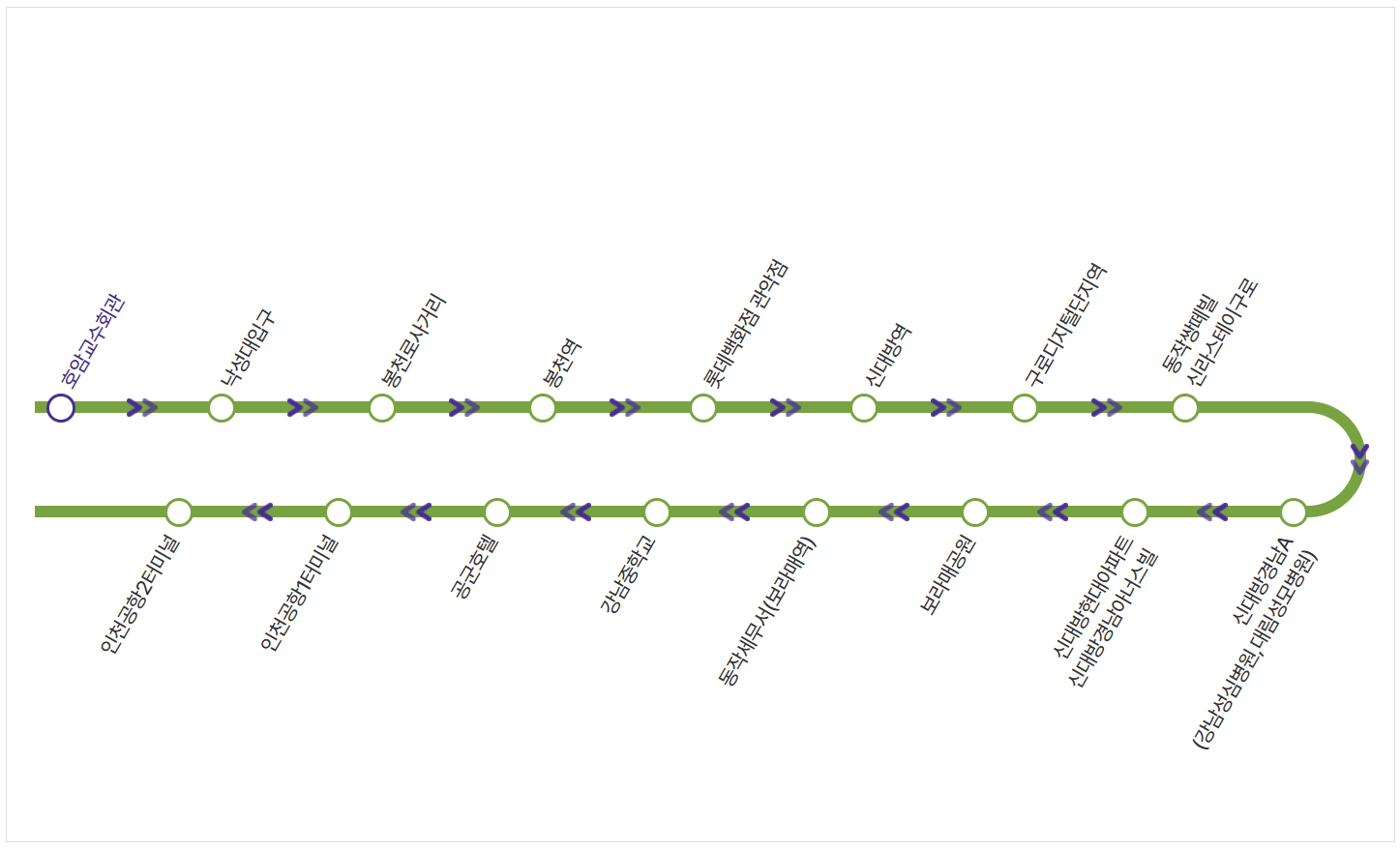 호암교수회관 >> 낙성대입구 >> 봉천로사거리 >> 봉천역 >> 롯데백화점 관악점 >> 신대방역 >> 구로디지털단지역 >> 동작쌍떼빌 >> 신라스테이구로 >> 신대방경남A (강남성심병원,대림성모병원) >> 신대방현대아파트 >> 신대방경남아너스빌 >> 보라매공원 >> 동작세무서(보라매역) >> 강남중학교 >> 공군호텔 >> 인천공항1터미널 >> 인천공항2터미널