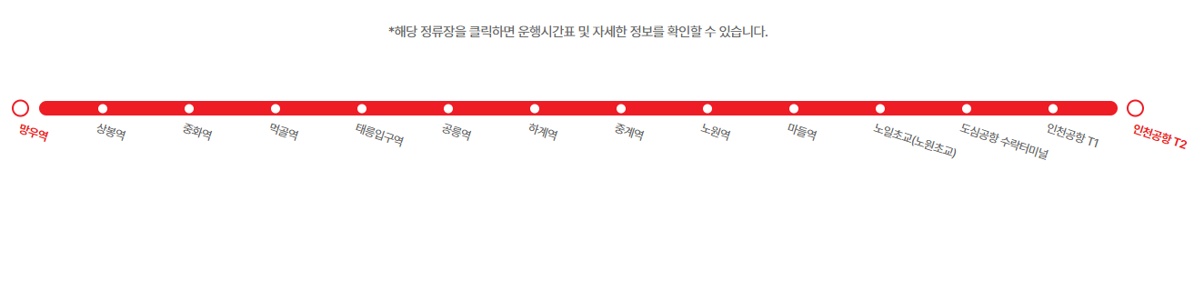 망우역 >> 상봉역 >> 중화역 >> 먹골역 >> 태릉입구역 >> 공릉역 >> 하계역 >> 중계역 >> 노원역 >> 마들역 >> 노일초교(노원초교) >> 도심공항 수락터미널 >> 인천공항 제1여객터미널 >> 인천공항 제2여객터미널