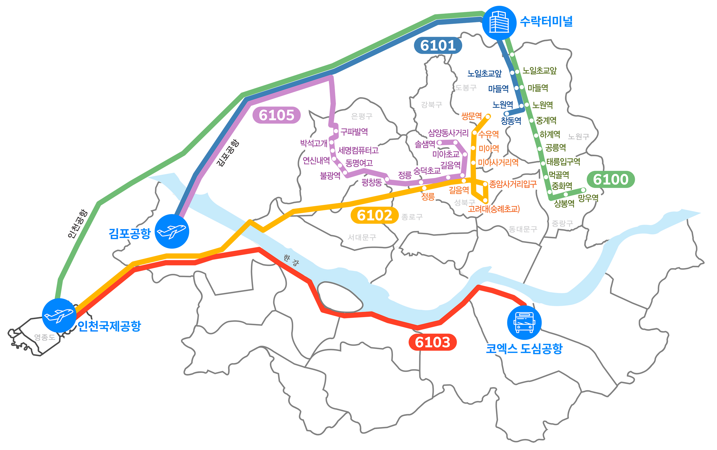 | 운행버스 | 6100 중랑 수락 6101 창동 노원 6102 강북 성북 6103 코엑스도심공항 6105 성북 은평 |