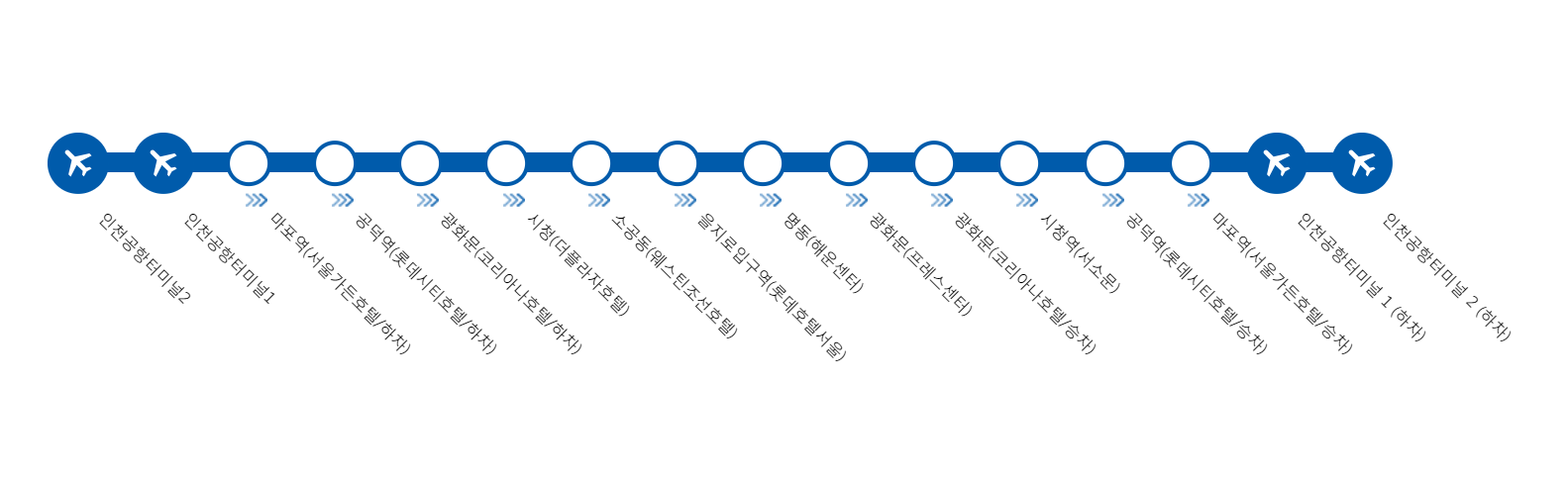 인천공항터미널2 >> 인천공항터미널1 >> 마포역(서울가든호텔/하차) >> 공덕역(롯데시티호텔/하차) >> 광화문(코리아나호텔/하차) >> 시청(더플라자호텔) >> 소공동(웨스틴조선호텔) >> 을지로입구역(롯데호텔서울) >> 명동(해운센터) >> 광화문(프레스센터) >> 광화문(코리아나호텔/승차) >> 시청역(서소문) >> 공덕역(롯데시티호텔/승차) >> 마포역(서울가든호텔/승차) >> 인천공항터미널 1 (하차) >> 인천공항터미널 2 (하차)