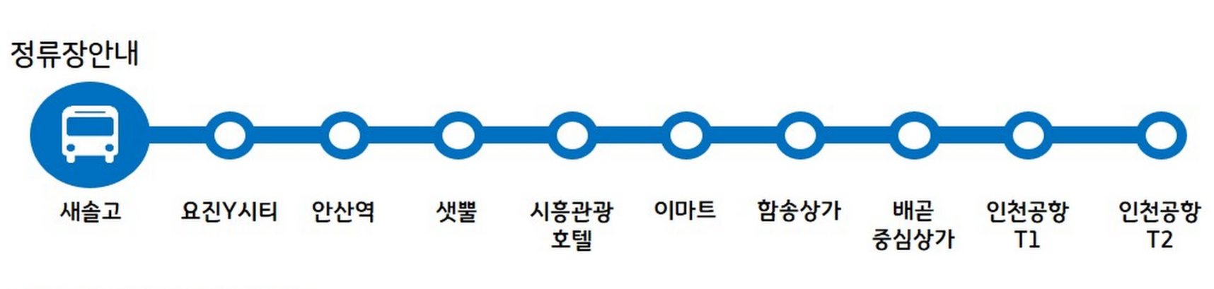 새솔고 >> 요진Y시티 >> 안산역 >> 샛뿔 >> 시흥관광호텔 >> 이마트 >> 함송상가 >> 배곧중심상가 >> 인천공항 제1여객터미널 >> 인천공항 제2여객터미널