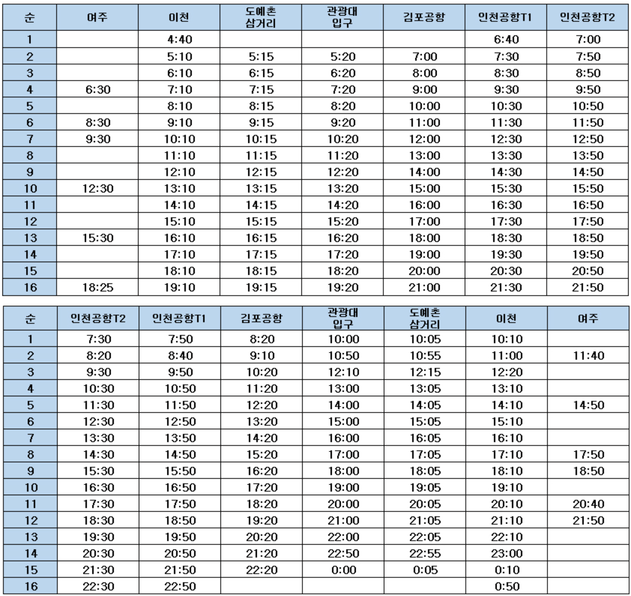 | 구분 | 여주 | 이천 | 인천공항 T2 | 인천공항 T1 |