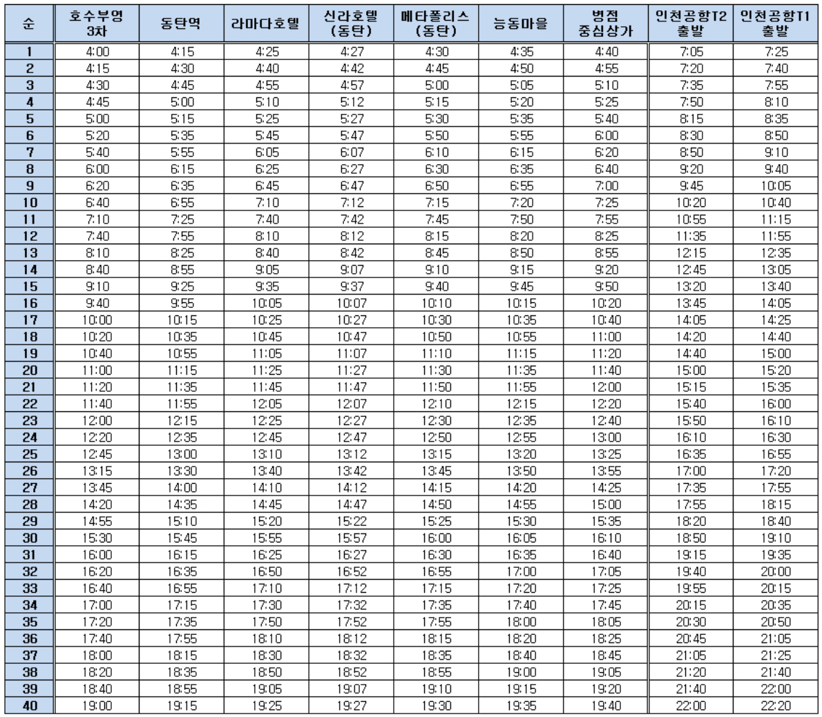 호수부영3차 >> 동탄역 >> 라마다호텔 >> 신라스테이(화성미디어센터) >> 다은마을 >> 능동주공단지 >> 병점중심상가 >> 인천공항 제1여객터미널 >> 인천공항 제2여객터미널