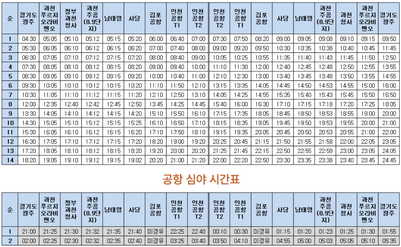 경기도 광주터미널 >> 과천푸르지오(르센토데시앙) >> 정부과천청사 >> 과천주공8·9단지 >> 남태령역 >> 사당역 >> 김포공항 국제선 >> 김포공항 국내선 >> 인천공항 제1여객터미널 >> 인천공항 제2여객터미널