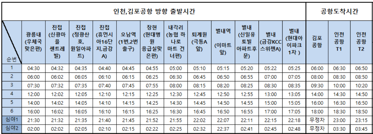 | 구분 | 광릉내 | 인천공항 T2 | 인천공항 T1 |