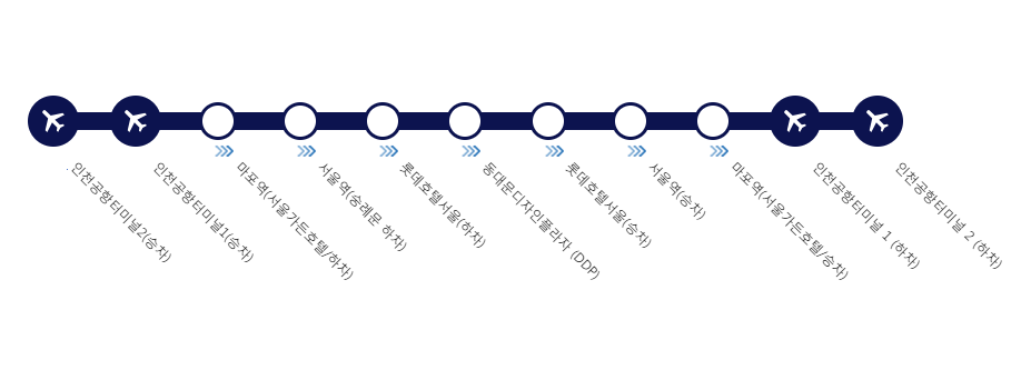 인천공항 제2여객터미널 >> 인천공항 제1여객터미널 >> 마포역 서울가든호텔 >> 서울역 숭례문 >> 롯데호텔서울 >> 동대문디자인플라자(DDP)