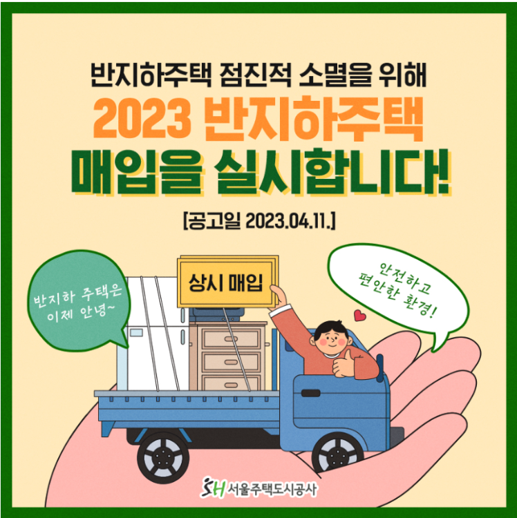 서울주택공사(SH)에서 시행하는 2023년 기존 반지하 주택 매입사업에 대해 검토했습니다. 장마철 침수피해로 생활이 불편했던 매도희망자 분에게는 좋은 기회가 되겠습니다. 선착순으로 진행하고 있으니 서둘러 접수를 해야겠습니다. 매매가격을 복수의 감점평가 가격으로 결정하니 합리적인 가격에 매도가 가능하겠습니다.