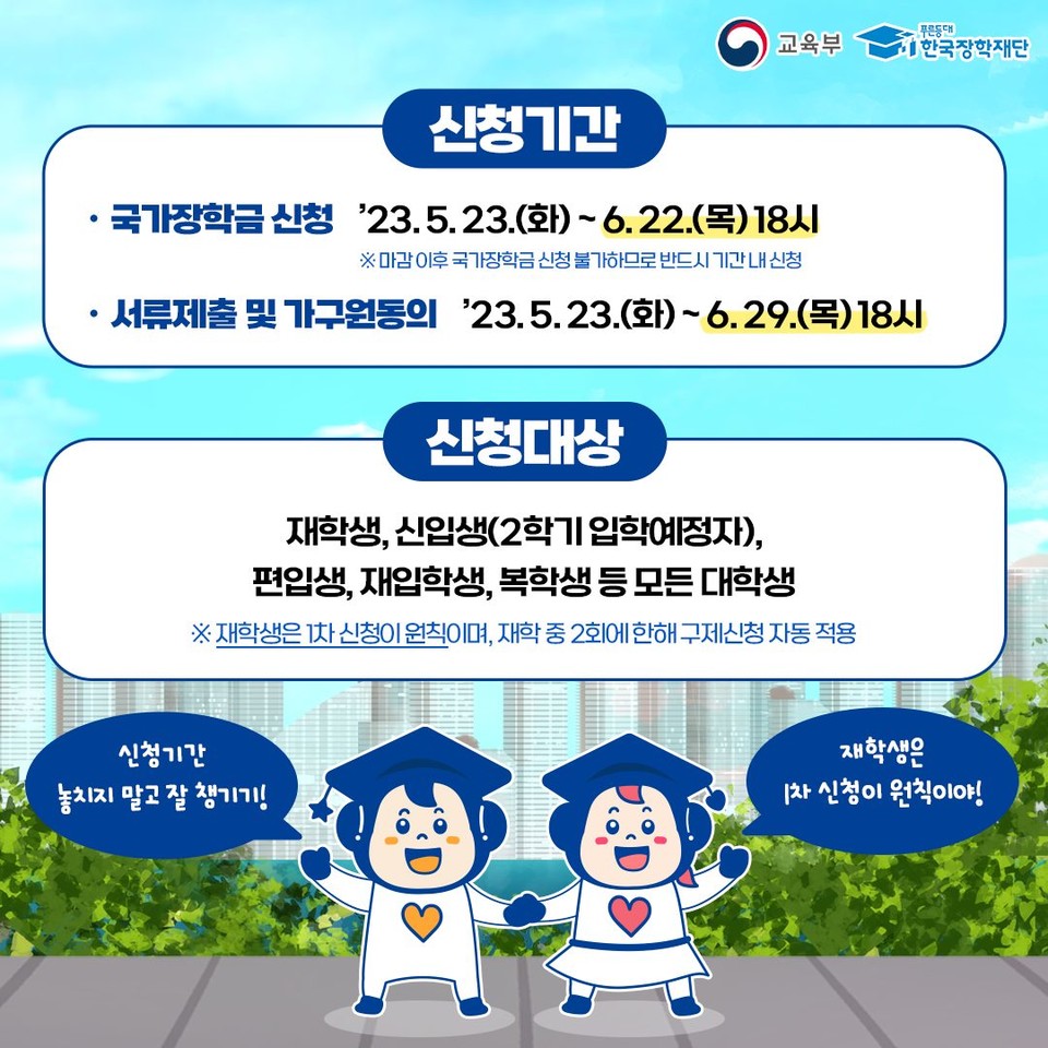 2023년 2학기 국가장학금 1차 신청 기간 및 관련 내용을 안내해 드립니다. 2학기 국가장학금이 6월 22일(목) 18시 신청마감입니다. 2학기 국가장학금은 한국장학재단 누리집(홈페이지)에서 늦지 않게 신청을 해야 국가장학금 혜택을 받을 수 있습니다. 2학기 국가장학금 내용을 확인하고 바로 신청해야 하겠습니다.