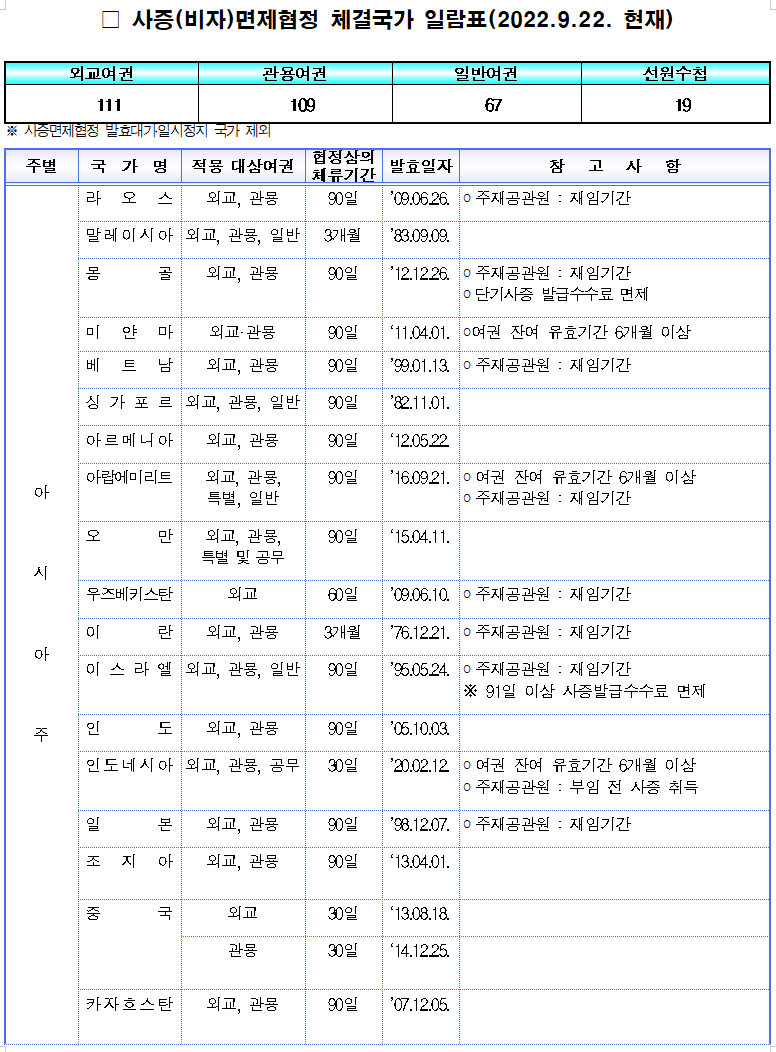 | 대한민국과 비자면제협정을 체결한 국가의 국민 | |
