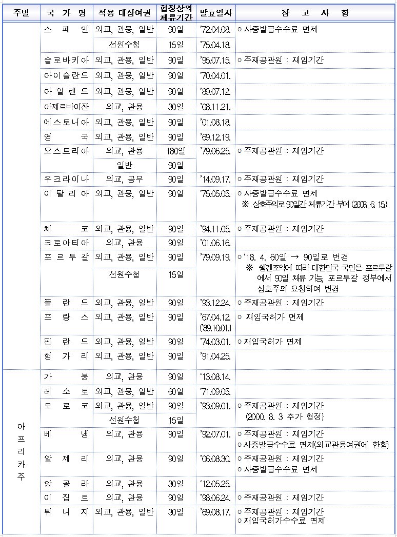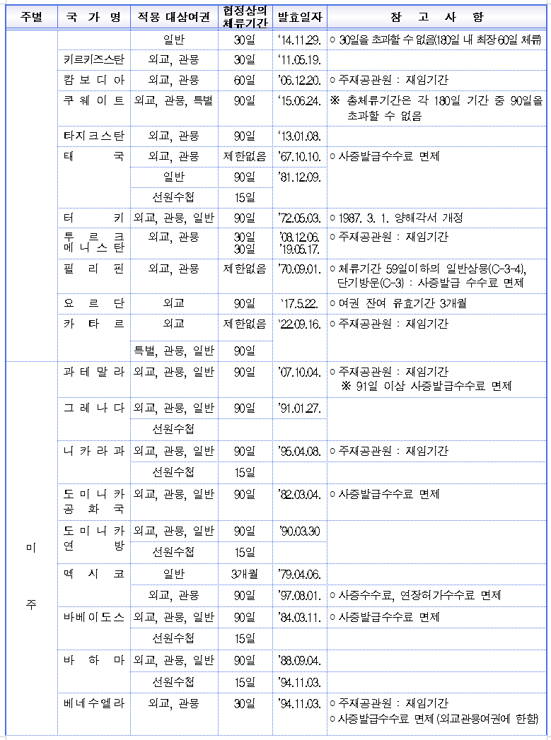 비자면제협정체결 국가 국민의 경우에도 체류기간이 협정기간(통상 3개월)을 초과하거나 단기취업 등 영리 또는 유급행위에 종사하고자 하는 경우에는 해당 비자를 발급받아 입국해야 합니다.